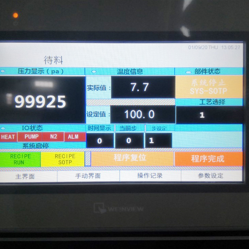 | Descrierea procesului de funcționare a echipamentelor | Echipamentul utilizează programarea controlului industrial PLC. Controlul programabil cuprinde starea de pornire/oprire a pompei de vid, setarea nivelului de vid, durata de menținere a vidului, timpul de umplere cu gaz inert, timpul de închidere a supapei solenoid de gaz inert și inițierea/încheierea ciclului de încălzire. | ||